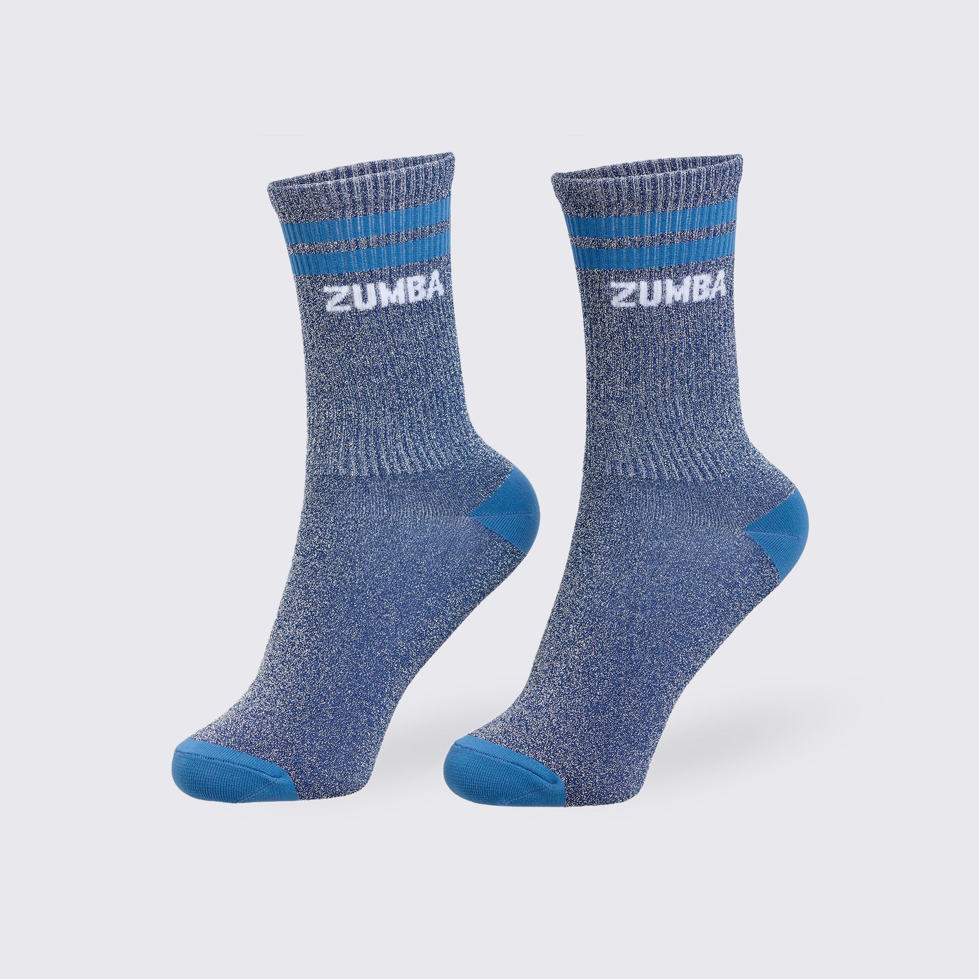 Step up your sock game with these Blue Jean High Socks in a rich navy shade. Designed with a cozy plush terry knit inside, they keep your feet comfy whether you're dancing or lounging. The sparkling Lurex threads add a fun, soft shimmer that catches the eye without sacrificing comfort. Featuring a playful contrast heel and toe, plus a bold Zumba logo with colorful stripes at the top, these socks bring energy and style to every step. Perfect for adding a pop of personality to your workout or casual wear!