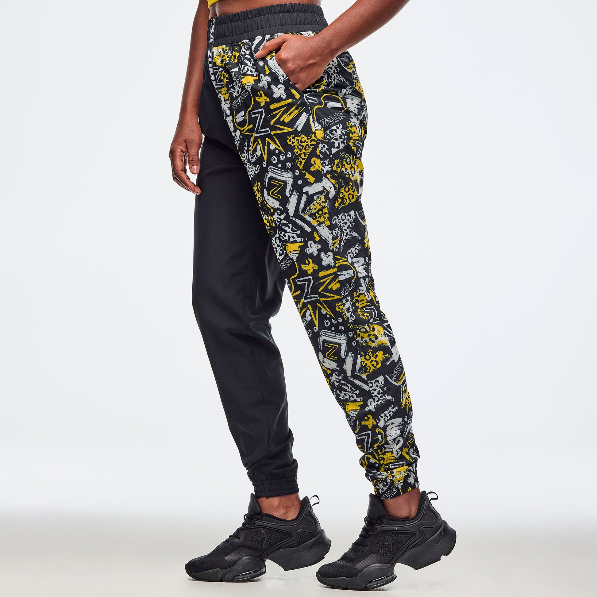 Experience the perfect blend of style and comfort with these high-waisted track pants featuring an easy fit and a long 28 1/2" inseam. They showcase encased elastic cuffs and convenient side pockets, highlighted by an exclusive Zumba color-blocked print. The functional Zumba-branded zipper at the front fly adds a unique and practical detail to this fan-favorite design.