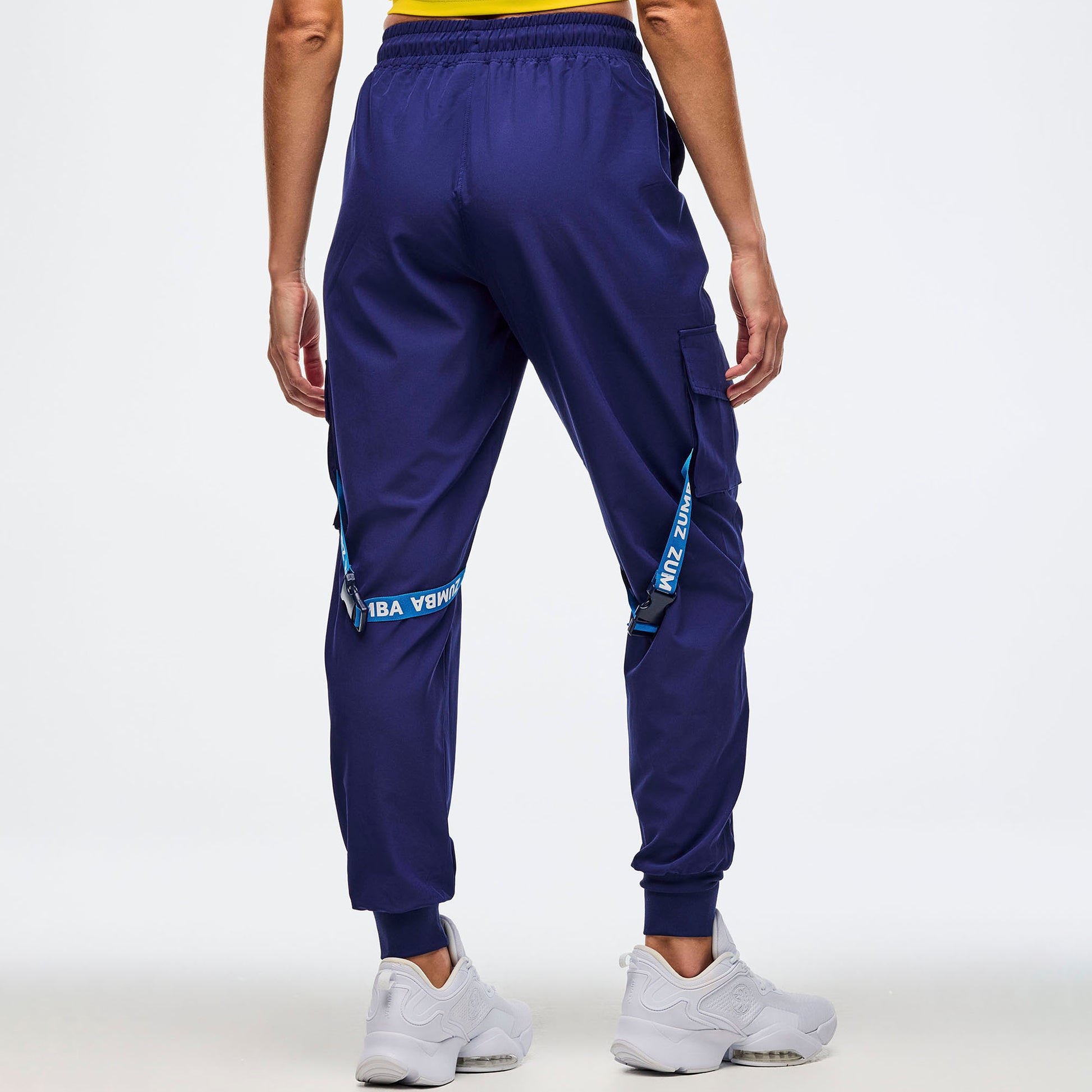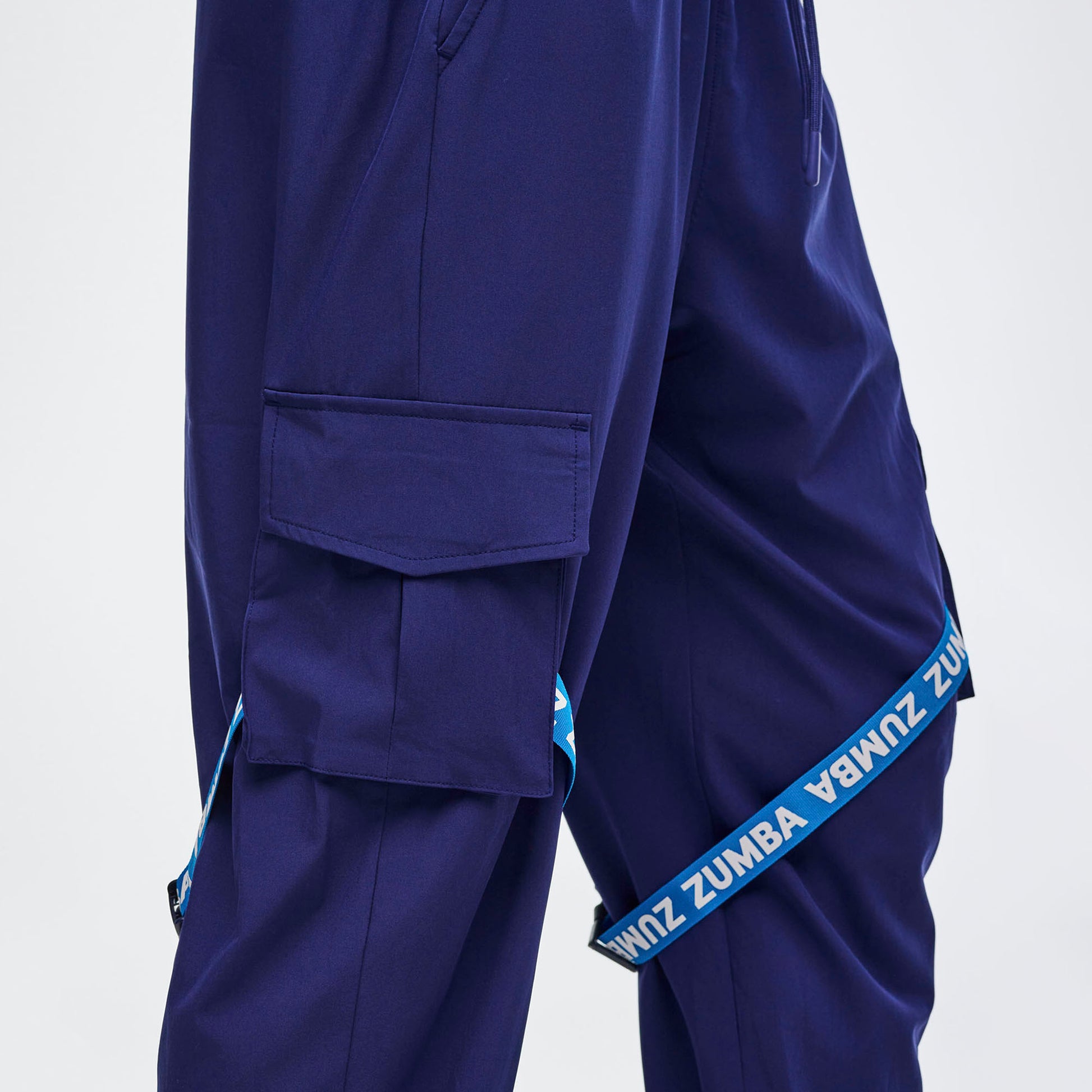 These men's woven cargo pants offer a relaxed fit and a long 29" inseam for comfortable wear. Designed with an encased elastic waistband and adjustable drawcords, they provide a secure fit. Features include slanted front pockets, side cargo pockets for extra storage, and distinctive Zumba-branded straps with functional buckles on the legs. Finished with rib-knit cuffs, these pants combine style and practicality for your active lifestyle.