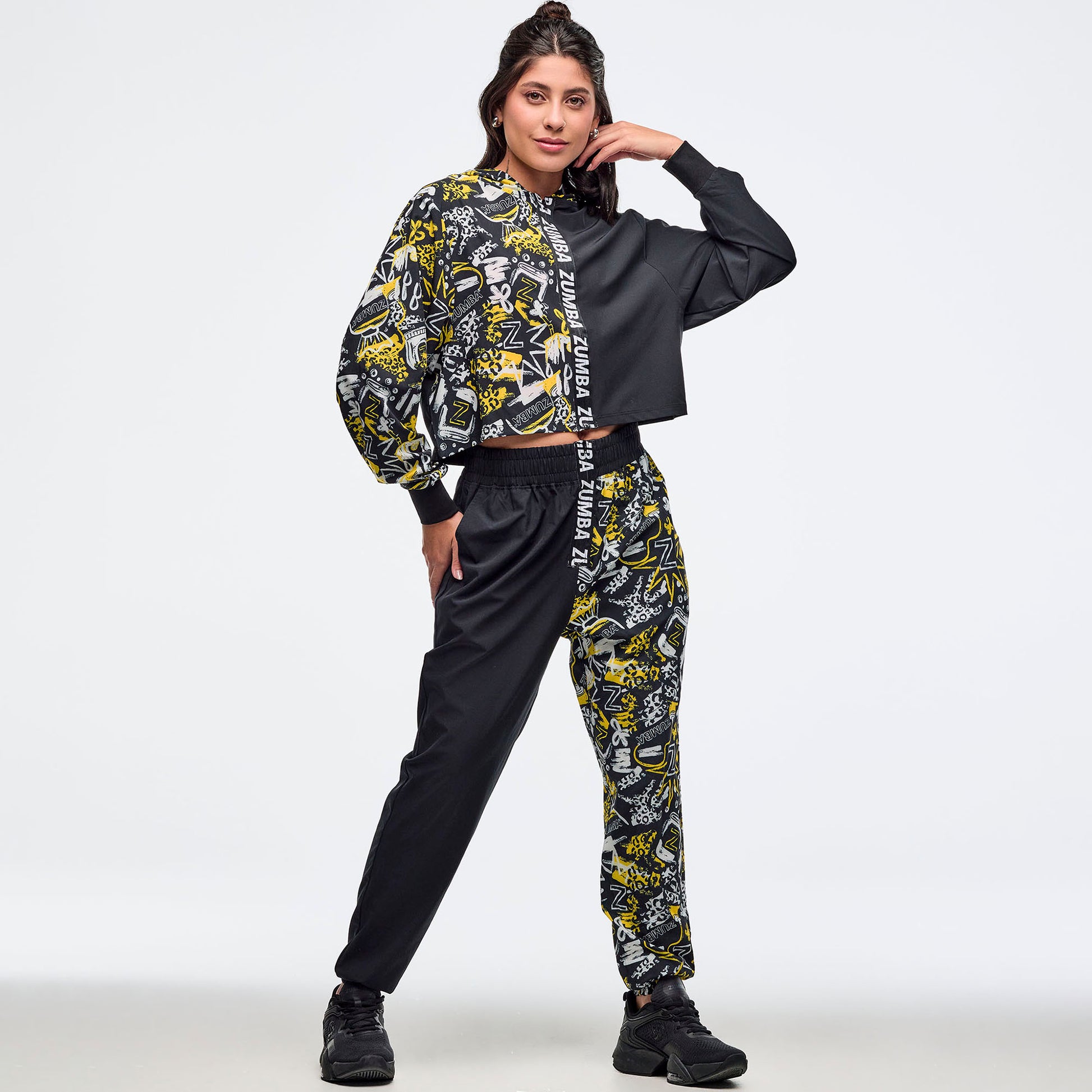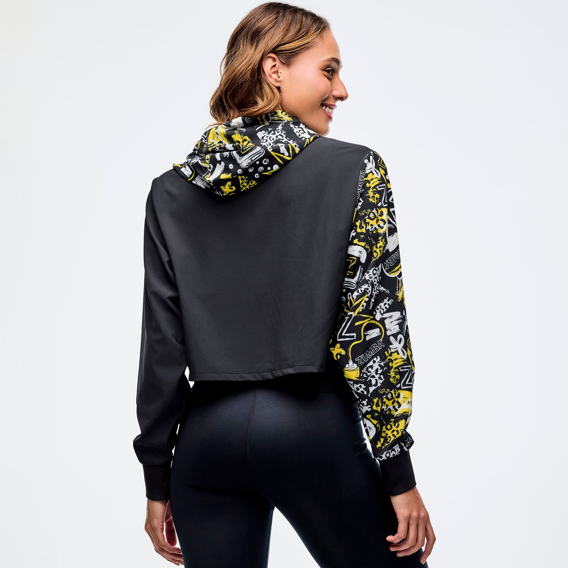 This crop-length woven zip-up hoodie offers a relaxed fit with a 20” front length in size S. Featuring a zip-front design, it combines a woven body with rib-knit cuffs for comfort. Its color-blocked style highlights an exclusive Zumba all-over print, paired with a branded Zumba zipper for a distinctive finish.