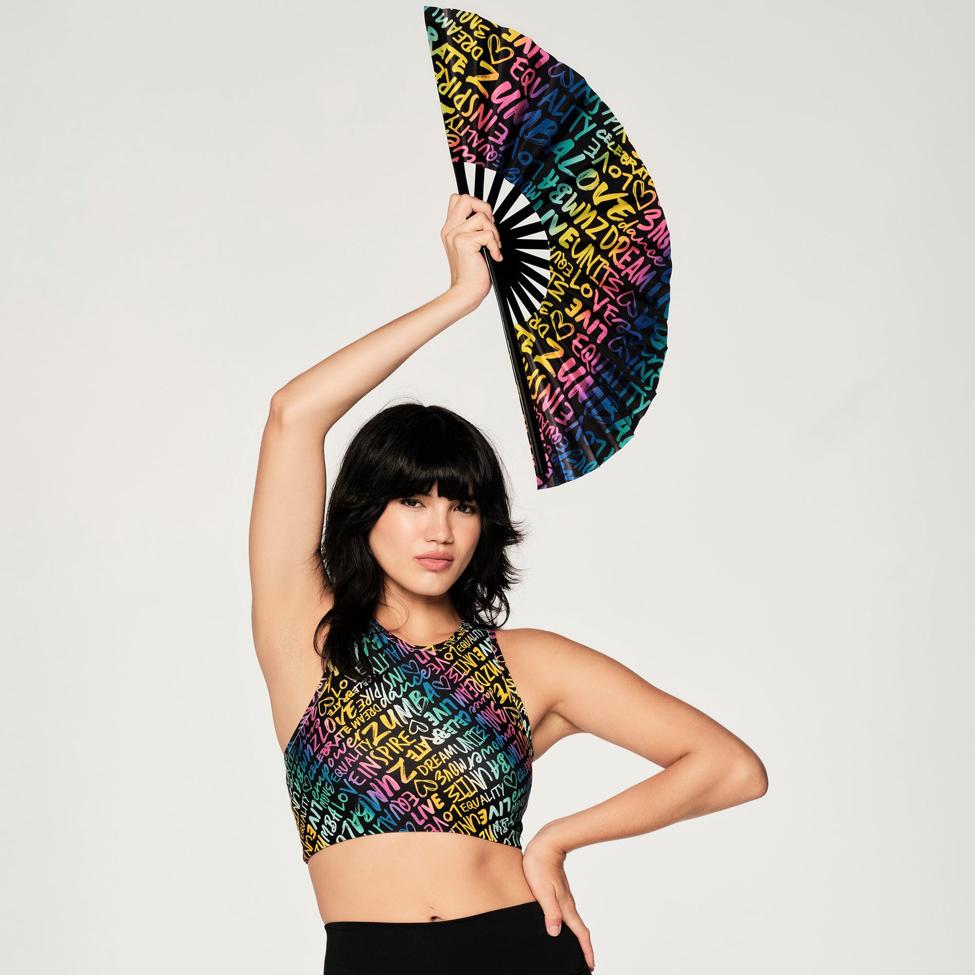 Open: H: 13Inches, W: 24 1/2InchesMulticolor Ombre Hand Fan Brightly colored ombre rainbow print with empowering messages of love and Zumba branding Bamboo Fan Sticks