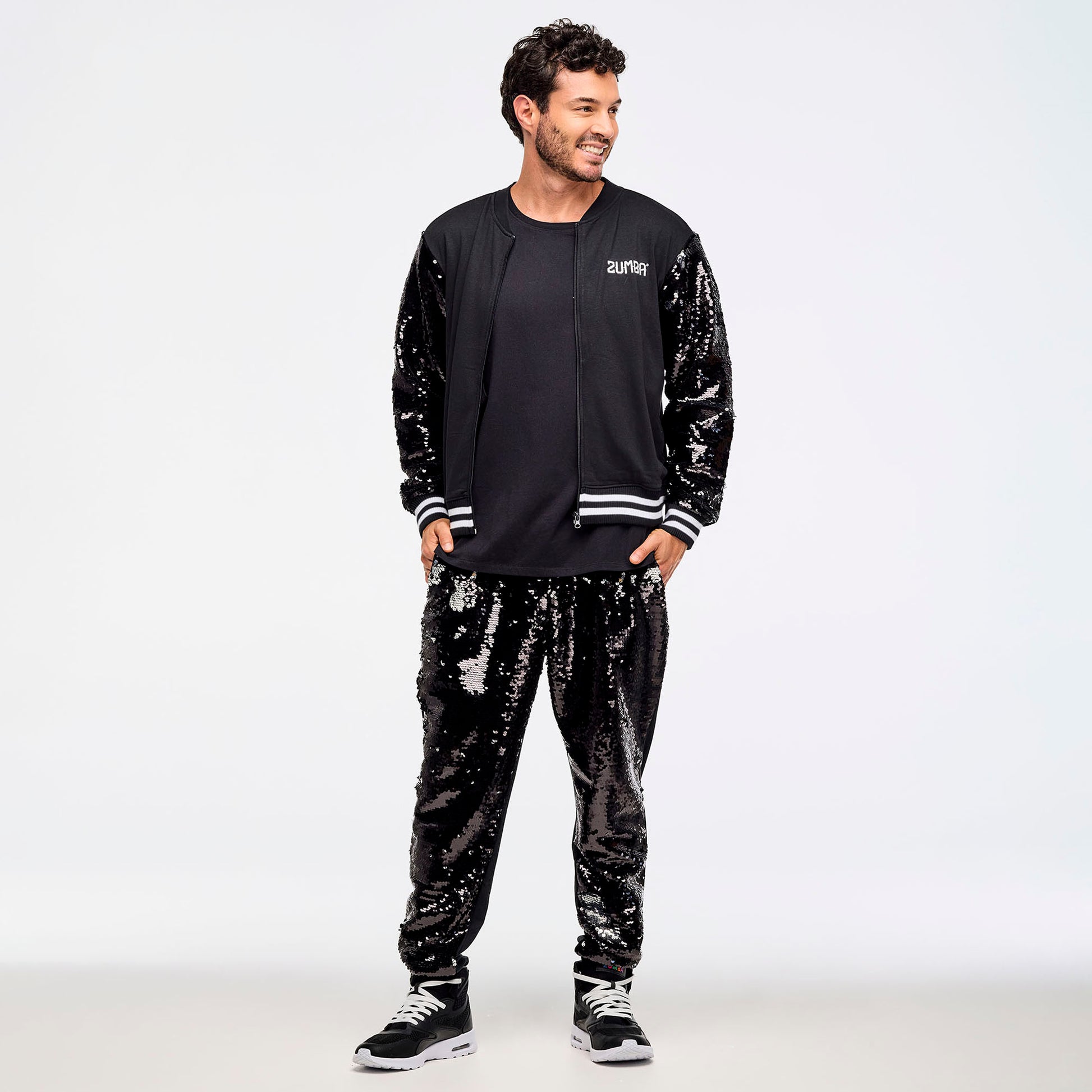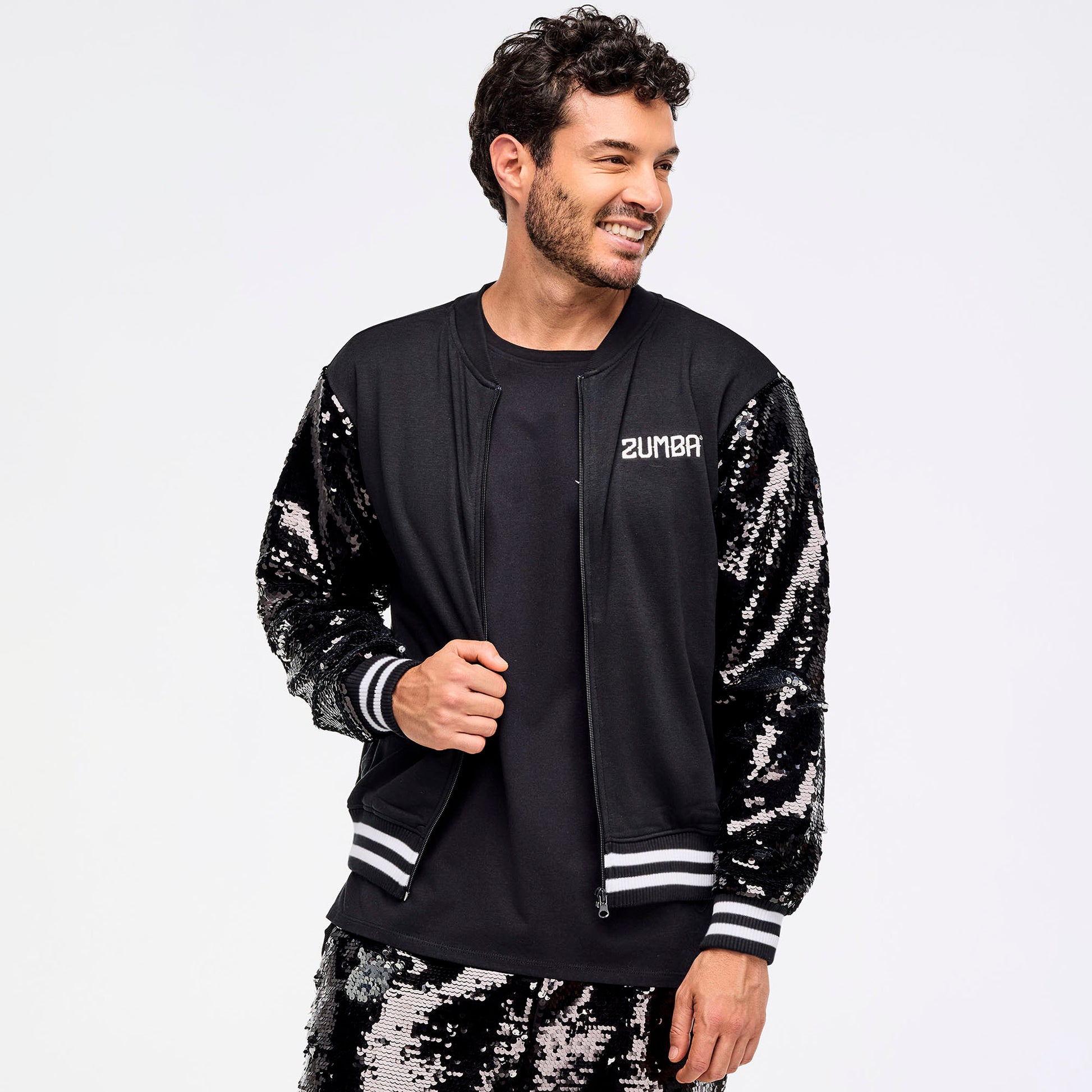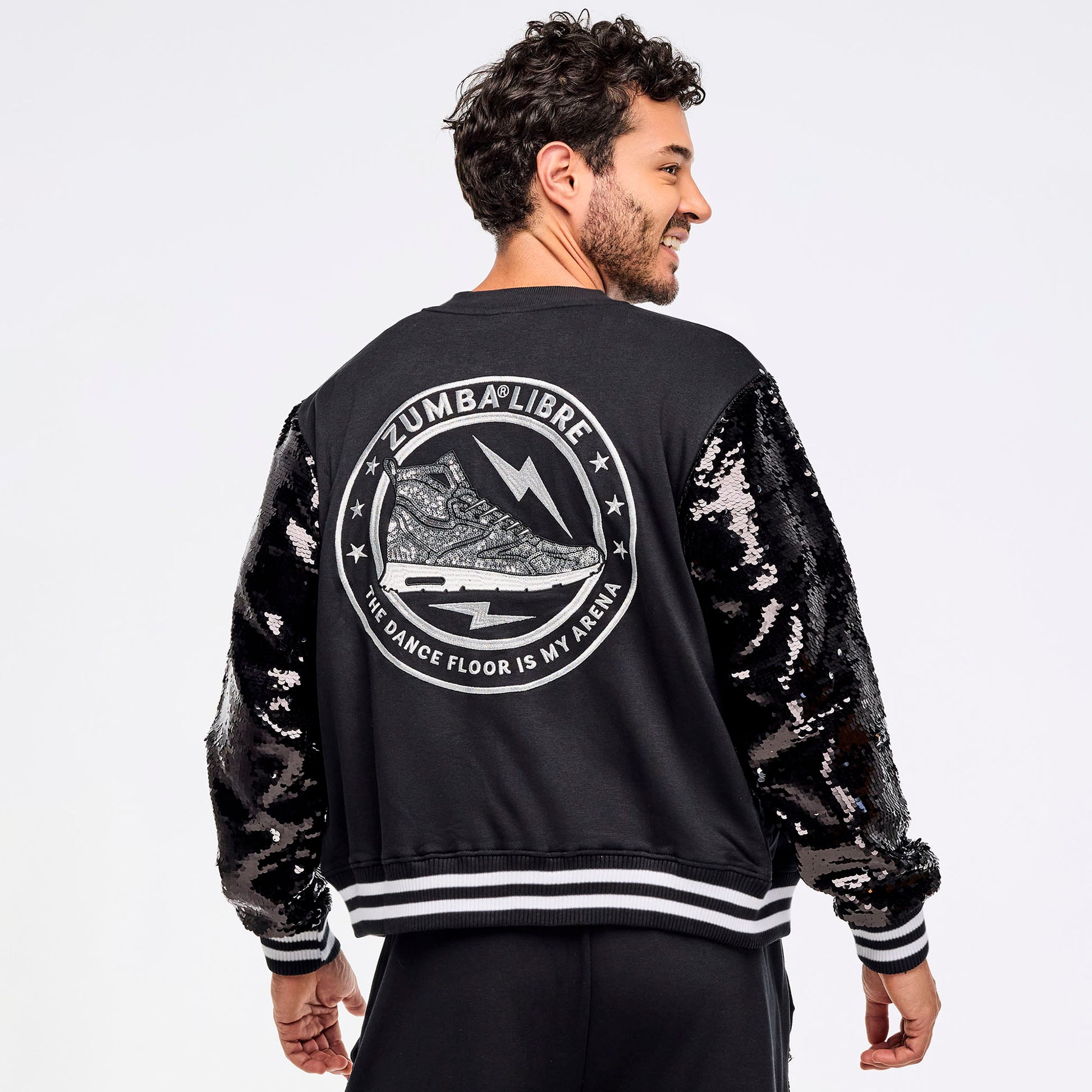 Elevate your dance style with the Zumba® Libre Bomber Jacket featuring dazzling sequin sleeves that change color with your moves—push down for sleek black, flip up for sparkling silver. This relaxed-fit, long-length jacket offers a comfy front zipper closure and handy inseam pockets to keep your essentials close. The striped rib collar, cuffs, and bottom band add a sporty touch, while the multidimensional branded graphic on the back shines with metallic embroidery and sequins. Crafted from soft Big Loop French Terry, it’s perfect for turning heads on and off the dance floor.