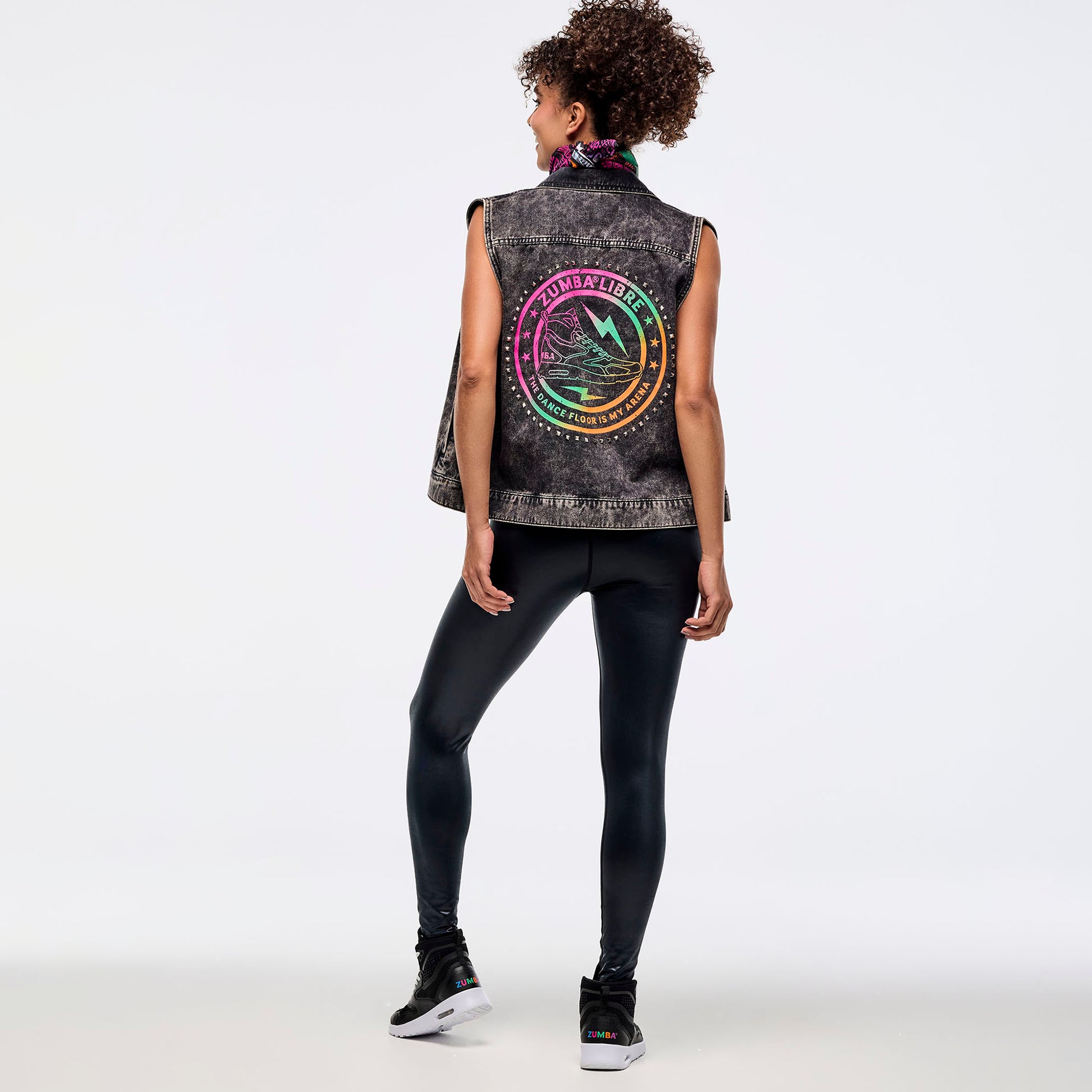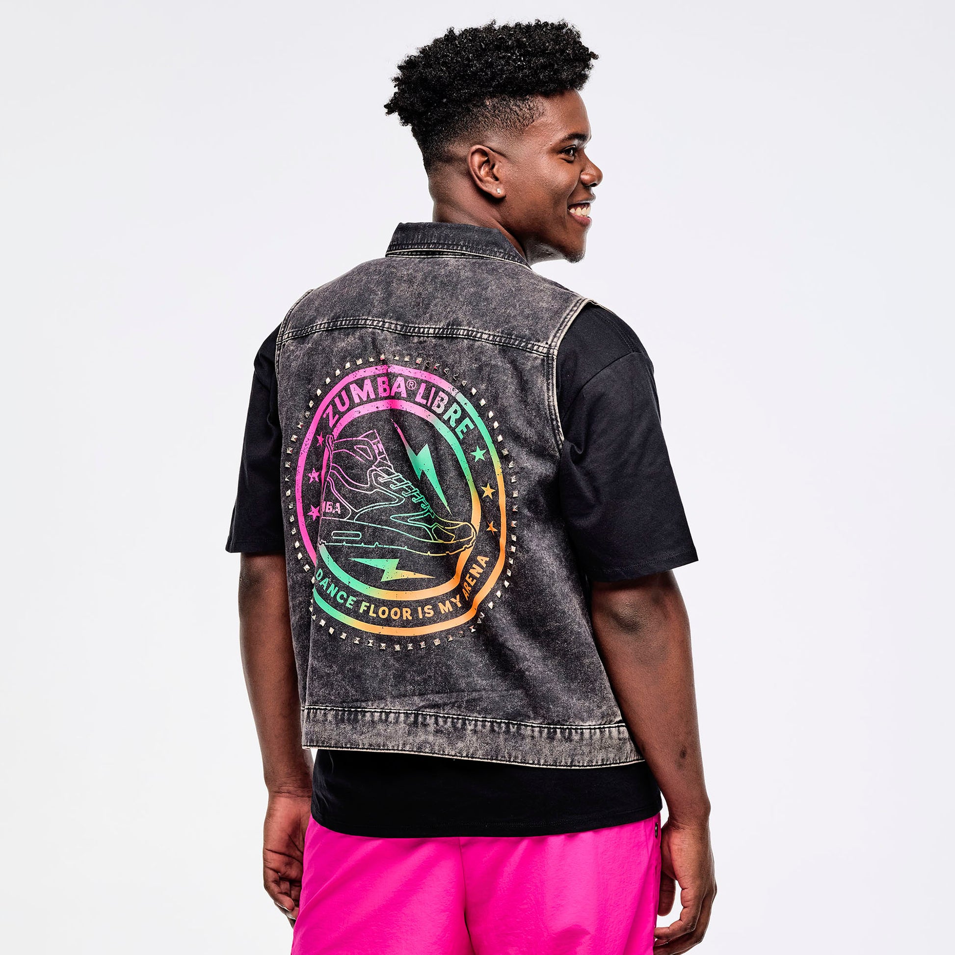 Get ready to turn heads with the Zumba® Libre Denim Vest! This relaxed-fit, regular-length vest features functional front shank button closures and handy welt pockets on the sides, perfect for keeping essentials close during your dance moves. Each vest boasts a unique denim wash, making yours truly one of a kind. Metal pyramid studs add an edgy flair around the front yoke and back artwork, while a vibrant multicolor gradient graphic print on the back brings a burst of energy to your look. Dance in style and stand out with this playful, bold statement piece!