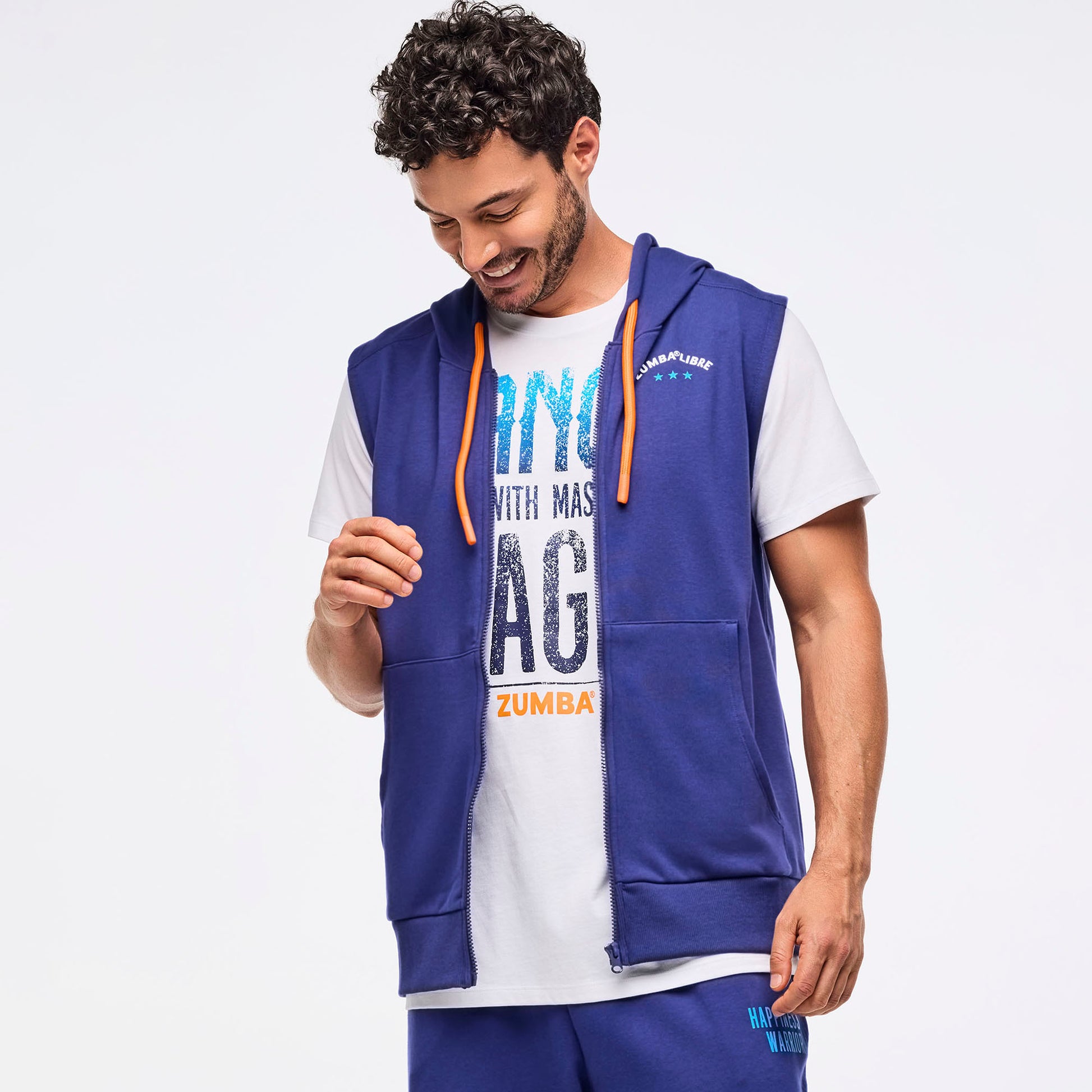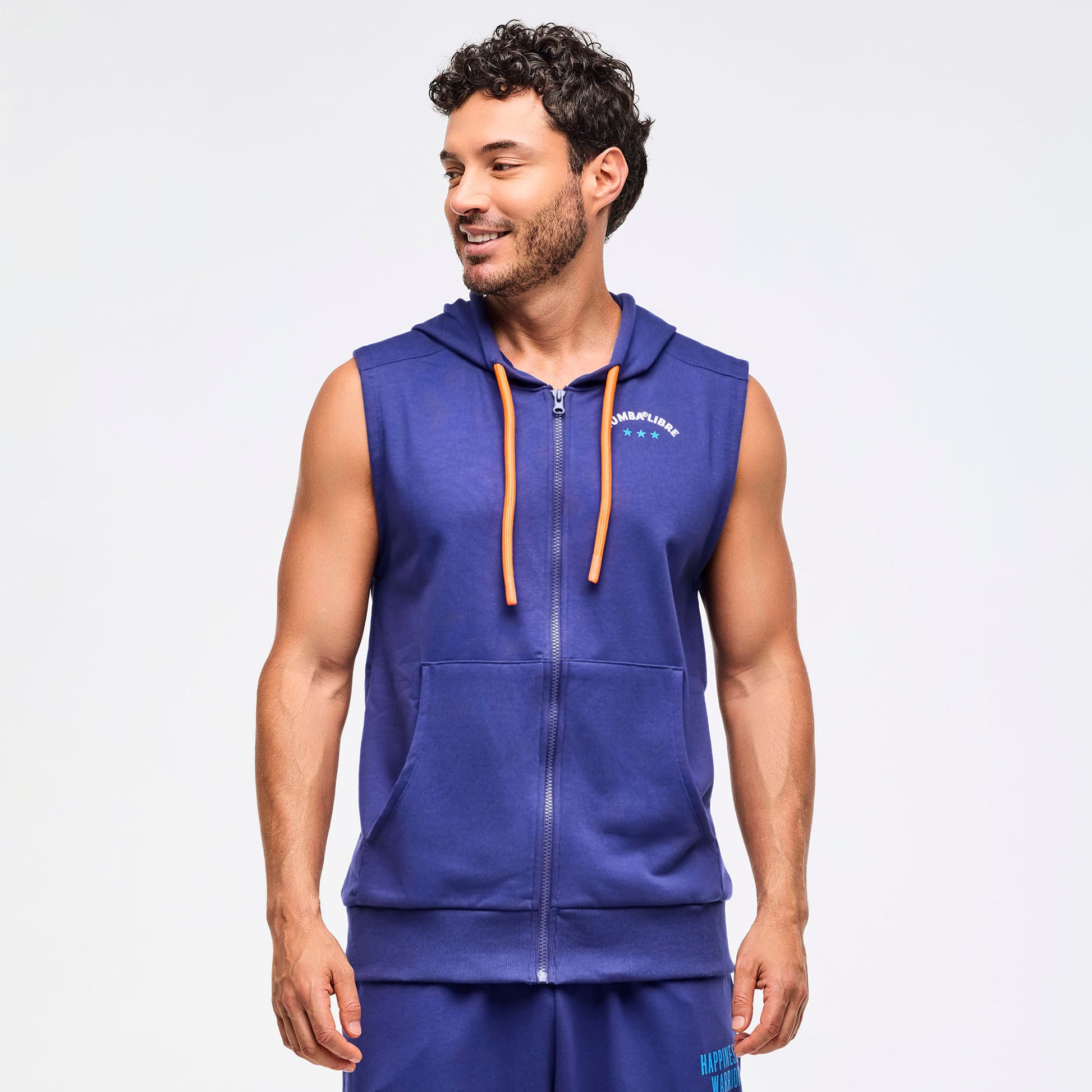 Get ready to move freely with the Zumba® Libre Men's Sleeveless Zip-Up Hoodie! Designed for easy fit and long length, this fan favorite combines comfort and style effortlessly. The functional drawcord on the hoodie lets you adjust your look, while the zip front closure makes it easy to throw on or take off. Keep your essentials close in the front kangaroo pockets, and enjoy the snug feel of the rib knit bottom band. The oversized Zumba-exclusive graphic print on the back adds a bold, playful touch. Made from soft Big Loop French Terry, it’s perfect for your dance sessions or casual days.
