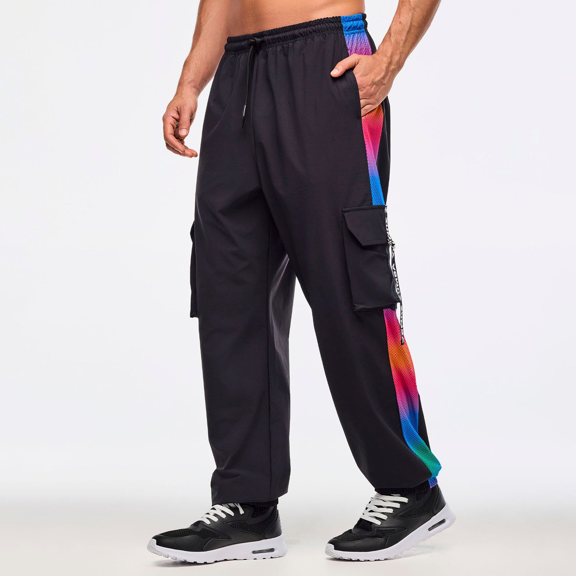 Get ready to move with the Zumba® Libre Men's Slouch Cargo Pants, designed for comfort and style. These oversized woven pants feature a 30" inseam and an encased elastic waistband with drawcords for a perfect fit—size down if you want a sleeker look. Practical side cargo and inseam pockets keep your essentials close, while elastic cuffs add a trendy touch. Eye-catching multicolor gradient mesh panels on the legs and branded trim on the pocket straps bring vibrant energy to your workout or streetwear. Made from stretchy nylon woven fabric,